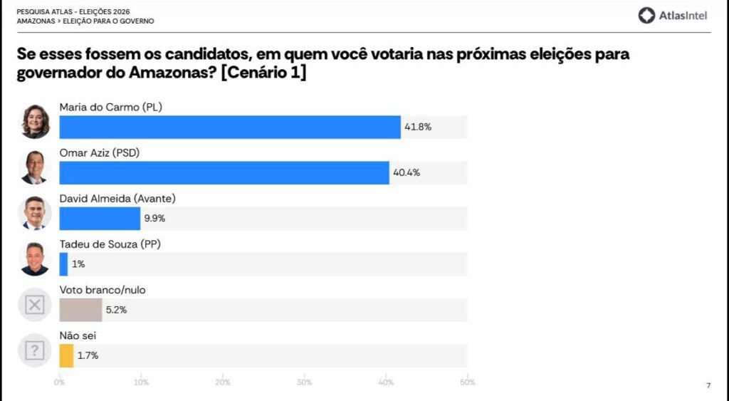 Nesta quarta-feira, 18/3, a pesquisa AtlasIntel confirmou o sentimento que tem tomado conta dos amazonenses: o desejo de mudança. O levantamento aponta a liderança da pré-candidata ao governo Professora Maria do Carmo (PL) nas intenções de votos contra nomes da velha política, tanto no primeiro como no segundo turno.Já apontada por institutos locais como a pré-candidatura que mais cresce nas pesquisas, Maria do Carmo consolida sua preferência junto ao eleitor. Conforme dados da AtlasIntel, a Professora soma 41,8% das intenções de votos, enquanto o senador Omar Aziz (PSD) tem 40,4%. O prefeito de Manaus, David Almeida (Avante), que enfrenta escândalos e alta rejeição em sua gestão, aparece com apenas 9,9%; e Tadeu de Souza (PP), que é apoiado pelo governador Wilson Lima (União) – apontado como o pior do Brasil –,surge com 1%. Branco ou nulo somam 5,2% e os indecisos, 1,7%.Em um eventual segundo turno, Maria do Carmo venceria tanto de Omar quanto de David. No primeiro cenário, a Professora teria 45,3% dos votos e Aziz teria 44,9%. A Professora Maria do Carmo também venceria David Almeida, com 46% dos votos, enquanto ele somaria 20,5%.*Senado*A pesquisa ouviu ainda os eleitores quanto à intenção de votos para o Senado, confirmando também que a direita vem forte no Congresso Nacional. O deputado federal do Partido Liberal, Capitão Alberto Neto (PL), aparece com 24%; Eduardo Braga (MDB) com 19,3%; Plínio Valério (PSDB) com 17,4%; Marcelo Ramos (PT) com 15,3% dos votos; Roberto Cidade (União Brasil) com 5,2%; Marcos Rotta (PDT) com 2,4%; e Marília Freire (PSOL) com 1,7% dos votos. Brancos e nulos seriam 10,1% e os indecisos somariam 4,7%.A pesquisa AtlasIntel ouviu 1.138 amazonenses em 61 municípios entre os dias 11 e 15 de março. A margem de erro é de três pontos percentuais e o nível de confiança é de 95%.FOTO – Assessoria MC