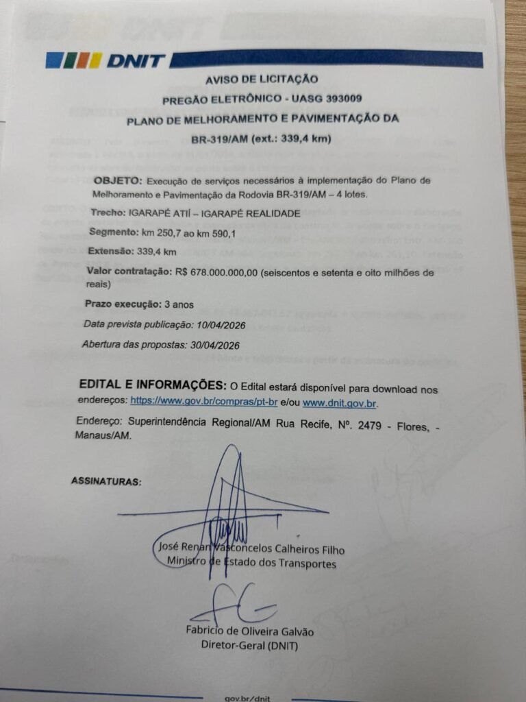 A espera de mais de quatro décadas para quem depende da conexão terrestre entre o Amazonas e o restante do Brasil acaba de ganhar um capítulo decisivo. Nesta terça-feira, o ministro dos Transportes, Renan Filho, anunciou oficialmente o lançamento do edital para o asfaltamento do primeiro lote de 30 quilômetros no emblemático “trecho do meio” da BR-319.A rodovia, que liga Manaus (AM) a Porto Velho (RO), é um dos gargalos logísticos mais sensíveis do país. Inaugurada na década de 70 e abandonada logo em seguida, a via tornou-se um símbolo de isolamento, onde veículos de carga e passeio enfrentam atoleiros intransitáveis durante o período de chuvas na Amazônia.O Plano de Recuperação: Investimento e PrazosO projeto anunciado pelo governo federal não se limita apenas aos 30 km iniciais. O plano de melhoramento abrange uma extensão muito maior, compreendida entre o quilômetro 250 e o 590 — justamente a área onde a pavimentação original desapareceu sob a selva.A licitação autorizada atinge o montante de R$ 678 milhões. Confira o cronograma:Publicação do Edital: 10 de abril (Diário Oficial da União).Abertura das Propostas: 30 de abril deste ano.Foco Inicial: Trecho entre a localidade de Realidade e o município do Careiro (AM).O Desafio Ambiental e LogísticoA BR-319 é o epicentro de um debate complexo. De um lado, o setor automotivo e de transporte de cargas clama pela rodovia como alternativa ao caro e lento transporte fluvial. De outro, especialistas e órgãos ambientais alertam para o risco de desmatamento em áreas preservadas e o impacto em terras indígenas que cercam o “trecho do meio”.A pavimentação desses primeiros 30 quilômetros representa uma “inflexão” na postura do governo, tentando equilibrar a necessidade de infraestrutura de transporte com o rigor das exigências ambientais.Para o motorista que se aventura pela região, a pavimentação significa o fim de uma era de incertezas. Se as promessas se converterem em asfalto, a BR-319 deixará de ser um “corredor de lama” para se tornar, finalmente, a espinha dorsal logística do Norte brasileiro.