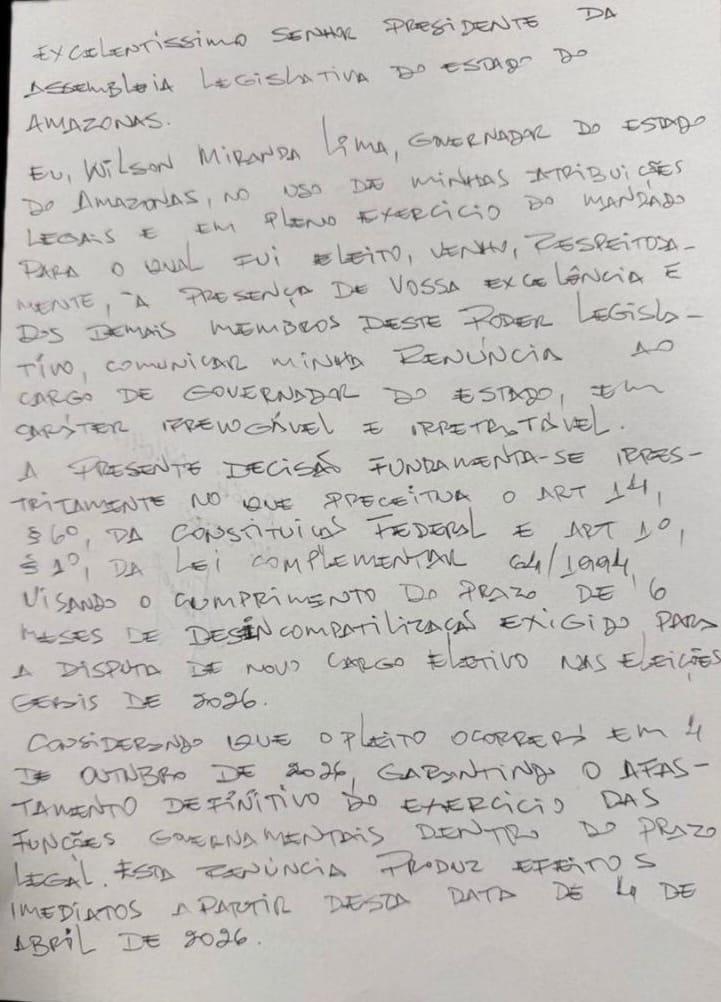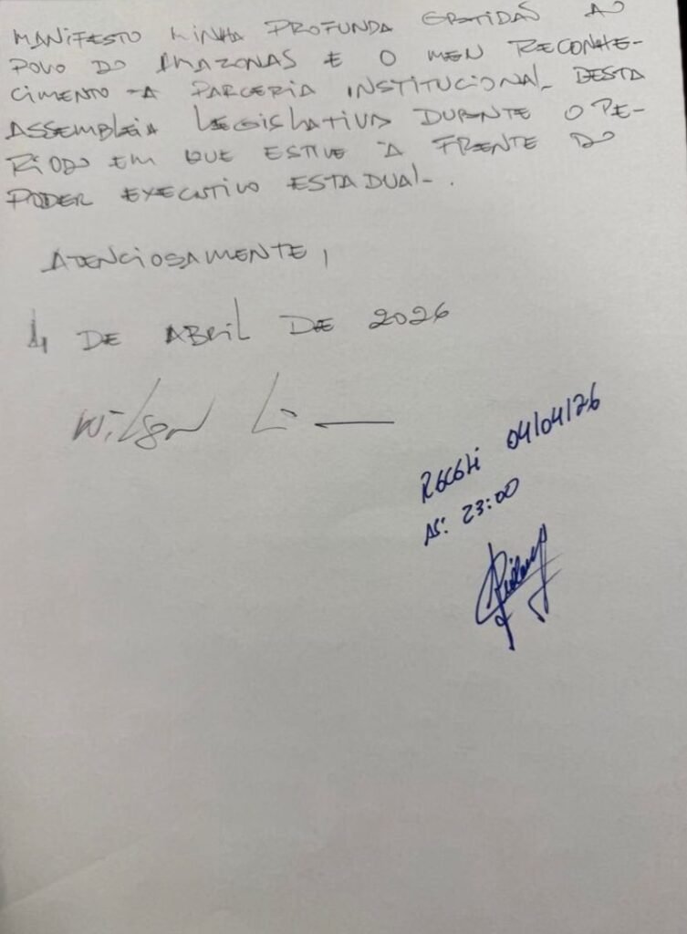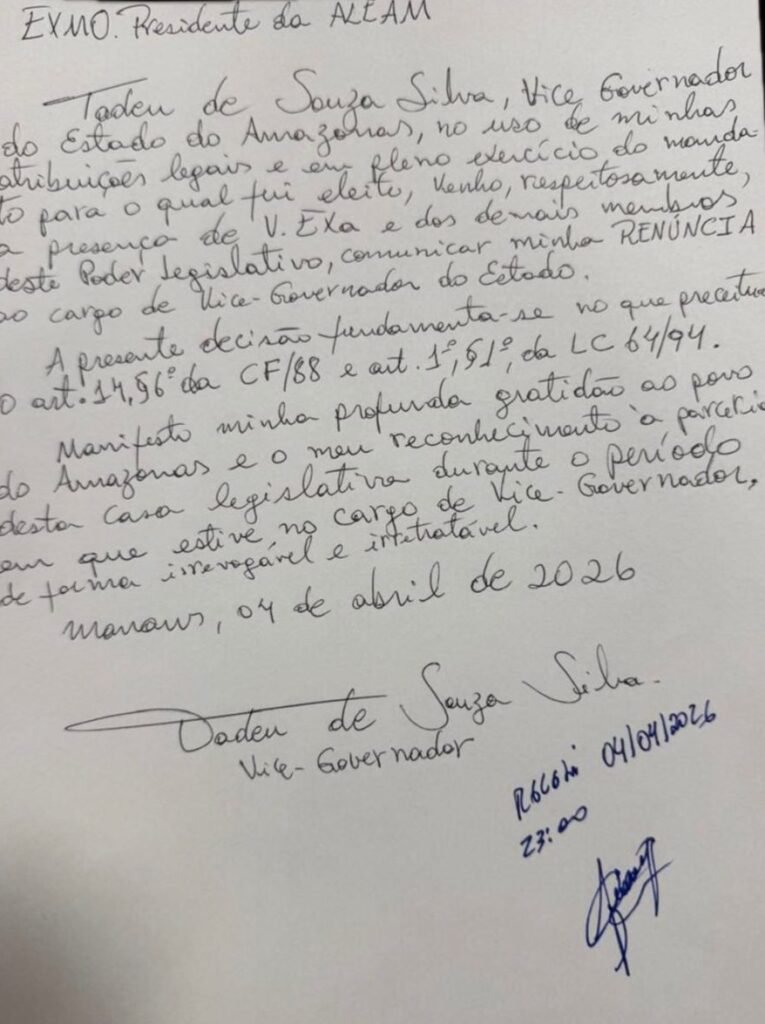 MANAUS – O tabuleiro político do Amazonas sofreu sua mudança mais drástica na noite deste sábado, 4 de abril de 2026. Em um movimento que pegou aliados e adversários de surpresa, o governador Wilson Lima (União Brasil) e o vice-governador Tadeu de Souza (PP) renunciaram simultaneamente aos seus cargos. A decisão, tomada no limite do prazo de desincompatibilização eleitoral, altera definitivamente o curso da administração estadual e antecipa as peças para o pleito de outubro.Com a vacância imediata dos cargos de governador e vice, o comando do Executivo estadual passa às mãos do deputado estadual Roberto Cidade (União Brasil), atual presidente da Assembleia Legislativa do Amazonas (Aleam).A Reviravolta de Wilson LimaA renúncia de Wilson Lima representa uma guinada em seu discurso oficial. Até poucas semanas atrás, o agora ex-governador assegurava publicamente que cumpriria seu mandato até o último dia, em 31 de dezembro de 2026. No entanto, a estratégia política pesou mais alto: Lima deixa o cargo para viabilizar sua candidatura ao Senado Federal.Em sua carta de renúncia, classificada como “irrevogável e irretratável”, Wilson Lima destacou que o gesto atende estritamente à legislação eleitoral. “Agradeço ao povo amazonense pela confiança e pela parceria institucional que mantivemos com a Assembleia Legislativa”, afirmou o político, reforçando que o efeito da saída é imediato.Tadeu de Souza e a vaga na Câmara FederalO vice-governador Tadeu de Souza também seguiu o caminho da desincompatibilização. Ao renunciar, Souza confirmou sua intenção de disputar uma vaga como deputado federal em Brasília. Em nota, ele classificou a saída como uma decisão de “serenidade e responsabilidade”, prometendo continuar sua atuação na vida pública em “novas frentes”.Roberto Cidade no PoderA ascensão de Roberto Cidade ao Palácio da Compensa coloca o presidente da Aleam em uma posição de enorme influência a poucos meses das eleições. Cidade, que já vinha consolidando sua liderança no Legislativo, agora assume o desafio de gerir a máquina estadual e garantir a estabilidade administrativa em meio ao fervor eleitoral.Analistas políticos apontam que a dupla renúncia não apenas redefine o governo, mas serve como o “tiro de largada” oficial para as articulações de 2026, onde Wilson Lima tentará levar sua aprovação do Executivo para as urnas em busca de uma cadeira no Congresso Nacional.